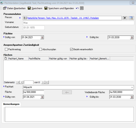 Über die Schaltfläche [Pächter verwalten] auf dem Reiter „Pächter“ können Sie Pächter neue hinzufügen und Flächen, sowie Pachtarten verwalten.