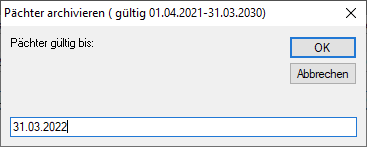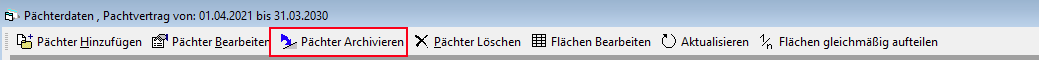 Um einen Pächter vorzeitig aus einem Pachtvertrag ausscheiden zu lassen, klicken Sie in der Maske zur Verwaltung der Pächter auf die Schaltfläche [Pächter archivieren].