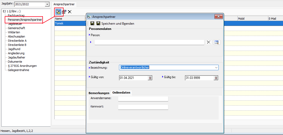 In diesem Bereich des Jagdbezirksnavigators können für den Jagdbezirk relevante Personen verwaltet werden, welche nicht im Bereich „Pachtvertrag“ aufgeführt sind. Bspw. können hier Ansprechpartner für Wildschäden oder die Onlineverantwortlichen für die „Condition Jagdstatistik/JagdOnline“ hinterlegt werden.