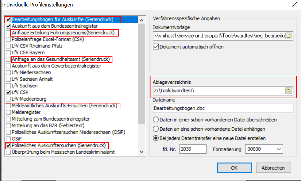3. In den von Ihnen genutzten Seriendruckprofilen muss das Ablageverzeichnis vorübergehend auf ein lokales Verzeichnis angepasst werden, in denen die betroffenen User entsprechende Schreibrechte haben.