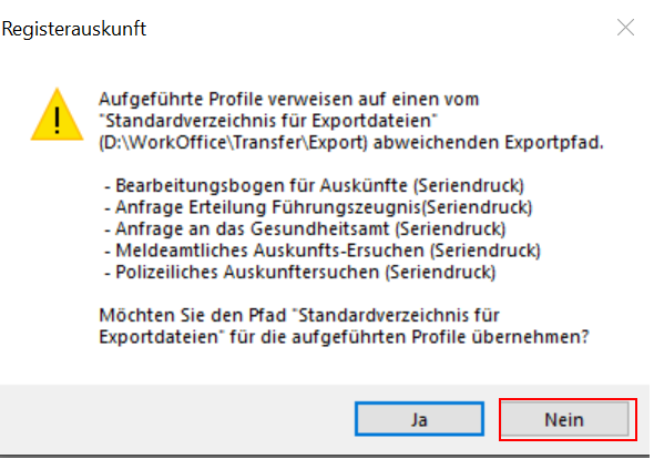 4. Beachten Sie, dass Sie die folgende Meldung nach Änderung und Klicken auf "OK" in der Optionsmaske mit "Nein" bestätigen, da die abweichend eingestellten Ablageverzeichnisse sonst wieder durch den Standard Exportpfad überschrieben werden.