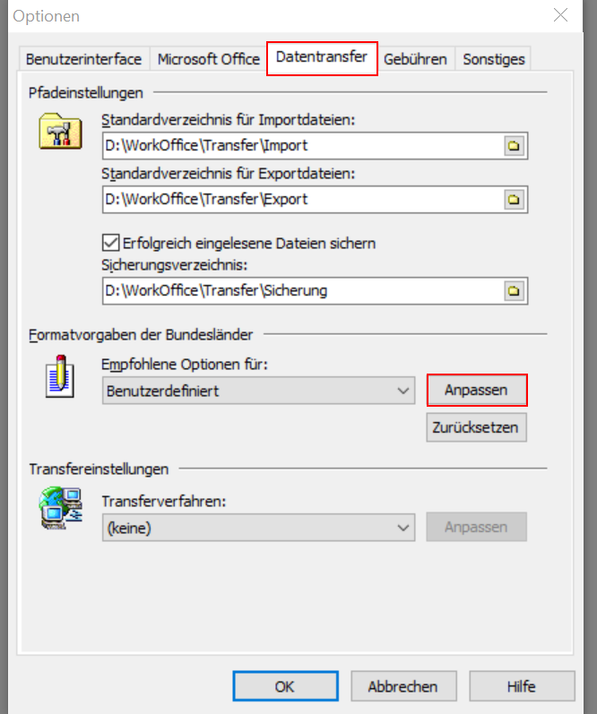 2. Wenn Sie sich im Reiter "Datentransfer" befinden, klicken Sie bei der Rubrik "Formatvorgaben der Bundesländer" rechts auf "Anpassen".