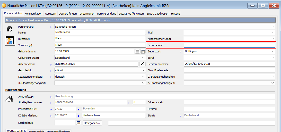- Ergänzen Sie den "Geburtsnamen" im gleichnamigen Felder der Personenmaske.