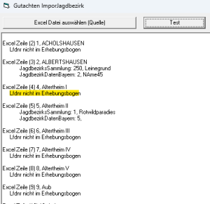 Das Programm geht nun alle Jagdbezirke oder Hegegemeinschaften durch und importiert die Daten aus der Excel Tabelle. - Wenn keine weiteren Fehler in der Import übersicht zu sehen sind, können Sie nun das Programm schließen. Der Importvorgang ist nun abgeschlossen.