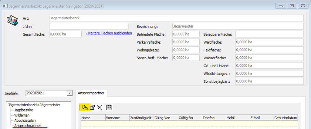 Zum Anlegen eines Onlineverantwortlichen (Kreisjägermeister) im Programm öffnen Sie zunächst den entsprechenden Jägermeisterbezirk. Klicken Sie dann auf den Reiter „Ansprechpartner“ und anschließend auf den Button [Hinzufügen].