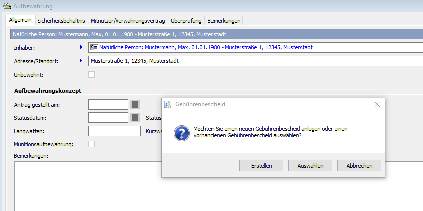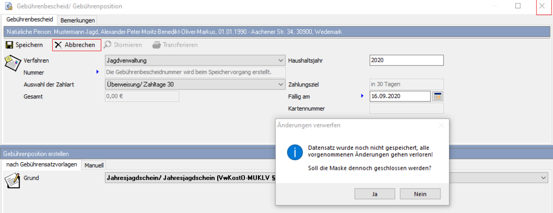 • Beim Schließen der prozessgesteuerten Gebührenerfassungsmaske wird nun ein Hinweis angezeigt, sobald die Gebührenerfassung ohne vorherige Speicherung durch den Sachbearbeiter abgebrochen wird.