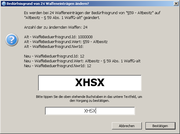Wurden vom Programm mehr als ein Waffeneintrag zur Datenbereinigung identifiziert, können Sie den Vorgang erst starten, wenn der geforderte Wert im oberen Bereich der Maske in das dafür vorgesehene Eingabefeld eingetragen wurde. Fahren Sie über die Schaltfläche [Bestätigen] fort.