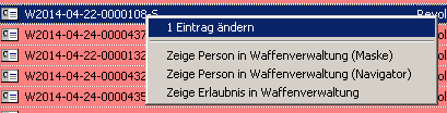 Durchführung der KorrekturWählen Sie den gewünschten Waffeneintrag aus der Liste aus und klicken Sie die markierte Zeile mit der rechten Maustaste an. Im Kontextmenü klicken Sie mit der linken Maustaste auf die Option „Eintrag ändern".