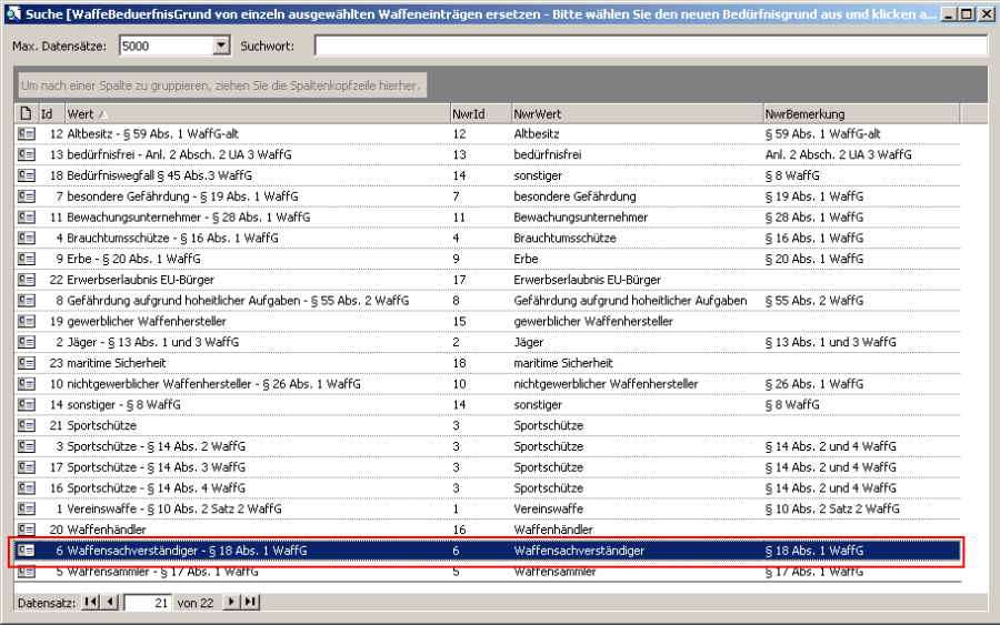 Es erscheint eine Suchmaske, in welcher Sie den neuen Bedürfnisgrund auswählen können, mit dem die Waffe sowohl im lokalen als auch im Datenbestand des NWR abgespeichert werden soll. Klicken Sie den gewünschten Wert doppelt mit der linken Maustaste an.