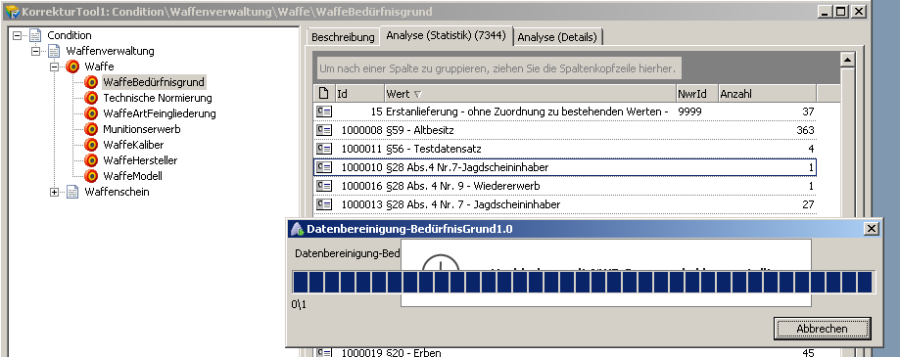 Die Regel „Waffe<span style="color: #1f497d">B</span>edürfnisgrund" unterstützt die teilautomatisierte Bereinigung unterschiedlicher Waffen mit gleichem Bedürfnis- bzw. Erwerbs<span style="color: #1f497d">G</span>rund, in dem gleiche nicht konforme Bedürfnisgründe von einzelnen Waffen durch einen <span style="color: #1f497d">X</span>Waffe<span style="color: #1f497d"></span>konformen Wert ersetzt werden.
