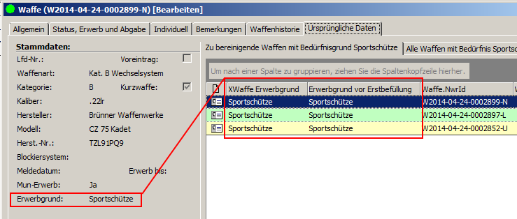 Hinweis: Ob eine Waffe bereits vor der Erstbefüllung mit dem Bedürfnisgrund „Sportschütze" in Ihrem lokalen Bestand erfasst war, können Sie in der Waffenmaske über den Reiter „Ursprüngliche Daten" unter der Rubrik „Erwerbgrund" einsehen. Waffen, die hier einen abweichenden Eintrag aufweisen, werden nicht in der „Bedürfnisgrundkorrektur für Sportschützen" (außer Punkt „…alle Waffen….") aufgeführt.