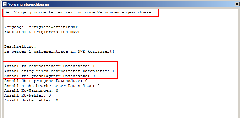 Beim Versuch eine Waffe aus diesem Bereich zu korrigieren, welche durch die Bereinigungstools als bereits im NWR konform gespeicherter Eintrag identifiziert wird, führt im Protokoll zur Auflistung „Anzahl übersprungene Datensätze: 1" und „Anzahl Ungültiger Waffebedürfnisgrund: 1"