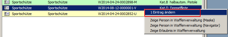 Durchführung der Korrektur Wählen Sie einen oder mehrere zu korrigierenden Waffeneinträge aus der Liste aus und klicken Sie die markierte Zeile mit der rechten Maustaste an. Im Kontextmenü klicken Sie mit der linken Maustaste auf den Punkt „Eintrag ändern".