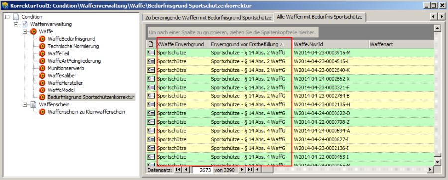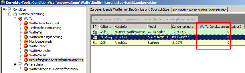 Mit Bedürfnisgrund „Sportschütze" erstbefüllt In der Liste werden die Waffen, welche mit Bedürfnisgrund „Sportschütze" erstbefüllt wurden, aufgelistet. Zusätzlich zum Bedürfnisgrund werden die Waffenart inkl. Feingliederung, der Kaliberangaben sowie das Modell angezeigt. Die zusätzlich eingeblendeten Angaben dienen der ggf. notwendigen weiteren Recherche. Eine Waffe aus dieser Kategorie kann mit einem nicht XWaffe-konformen Bedürfnisgrund im Bestand des NWR gespeichert sein, muss es aber nicht. In der Regel wurden bereits alle Waffeneinträge mit einer Objektversion > 0 einmal bearbeitet und mussten somit in Condition WorkOffice zwingend XWaffe konform korrigiert werden (gilt möglicherweise nicht für ÖWS anderer Hersteller).