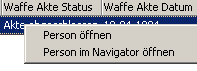 Klicken Sie einen Datensatz innerhalb der Ergebnisliste mit der rechten Maustaste an, öffnet sich ein Untermenü, aus dem Sie die Person zur weiteren Bearbeitung in der Personenmaske oder im Navigator öffnen können. Es wird empfohlen, für alle Personen im Bereich „Akte abgeschlossen" ein Löschdatum im Feld „Datenaufbewahrung bis" in der Personenmaske festzulegen.