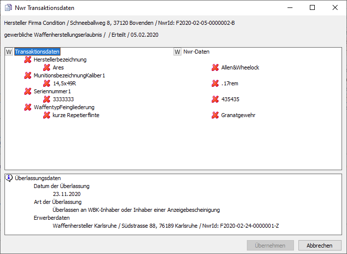 Überprüfen Sie, ob die Waffe zwischen dem Meldezeitpunkt und Ihrem Aufruf der Transaktionsdaten evtl. bereits weiterüberlassen wurde.