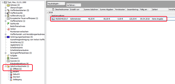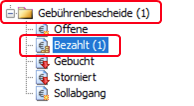 Nachdem der Personennavigator mit Hilfe der [F5]-Taste aktualisiert wurde, finden Sie den Gebührendatensatz unter dem Punkt „Gebührenbescheide -> Bezahlt“.