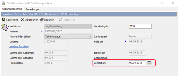 Tragen Sie nun in der Gebührenbescheid-Maske im Feld „Bezahlt am“ ein entsprechendes Datum ein. Speichern Sie Ihre Eingaben über die Schaltfläche [Speichern] in der linken oberen Ecke der Maske ab.