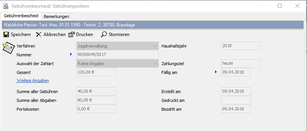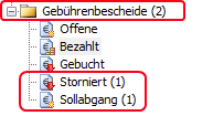 Abschließend bestätigen Sie die Eingabe mit [Speichern] und schließen die Gebührenmaske. Nach einer Aktualisierung des Personennavigators über die [F5-Taste] sehen Sie die Gebühr unter dem Punkt „Gebührenbescheide –> Storniert“ sowie unter „Sollabgang“.