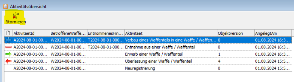 - Öffnen Sie die Waffenbesitzkarte, auf der die Waffe mit der zu stornierenden Aktivität eingetragen wurde.