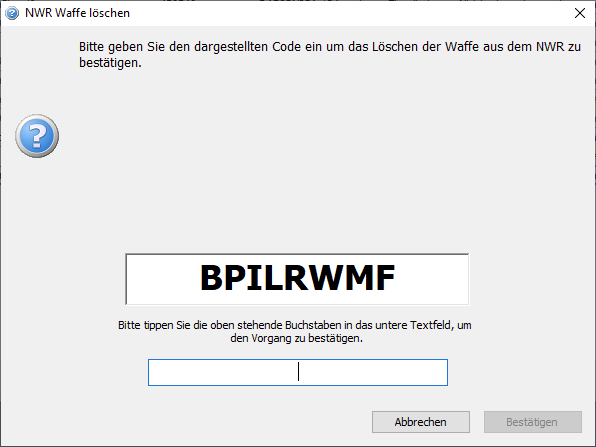Sofern der von Ihnen ausgelöste Verwaltungsakt eine Rückgängigmachung der Eintragung oder Überlassung erfordert, löschen Sie die betroffene Waffe bitte NICHT, wenn die Waffenverwaltung von Ihnen die Eingabe eines Löschcodes fordert! Stellen Sie nochmals sicher, dass der gewünschte Bezug zwischen Erlaubnis und Waffe durch Eintragung des Datensatzes auf der korrekten Erlaubnis bzw. in der korrekten waffenrechtlichen Zuständigkeit erfolgt ist.