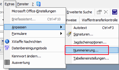 - Um die laufende Nummerierung für einen einzelnen Erlaubnistyp oder für alle Erlaubnistypen in Ihrem Bestand zurückzusetzen, öffnen Sie bitte über das Menü “Extras” den Unterpunkt “Anpassen – Nummerierung”.
