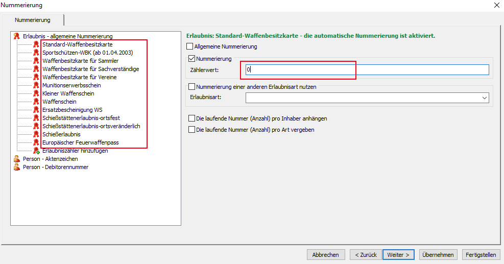 - Anschließend tragen Sie im rechten Bereich der Maske im Feld “Nummerierung” den Zählwert 0 ein und speichern Ihre Eingaben mit Hilfe der Schaltfläche [Fertigstellen] ab.