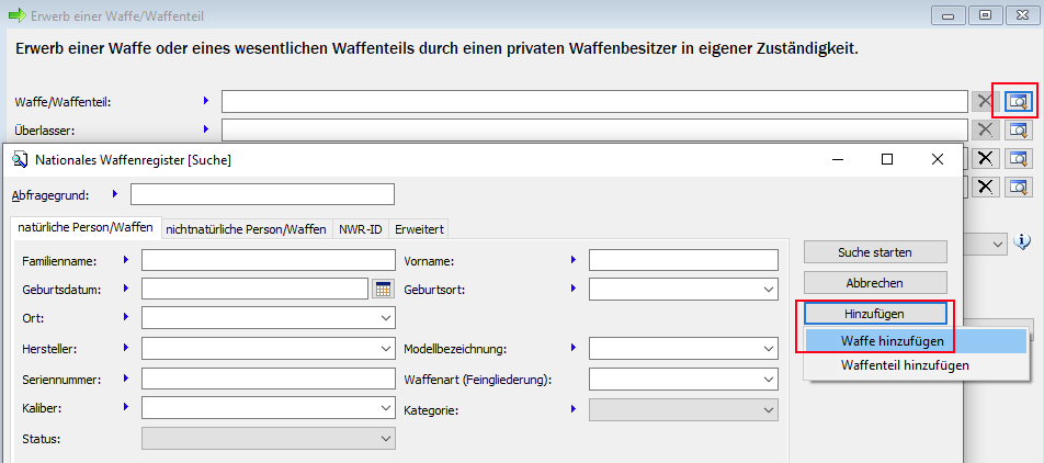 Sollten die zu verbauenden Waffenteile bisher noch nicht im NWR registriert worden sein, müssen diese zuvor analog der unter 3. beschriebenen Vorgehensweise durch den Sachbearbeiter erfasst werden.