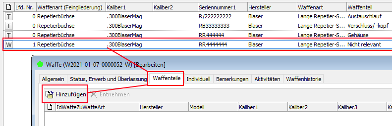 https://www.bka.de/SharedDocs/Downloads/DE/UnsereAufgaben/Aufgabenbereiche/Waffen/leitfadenWaffenteile.html - Im Feld "Seriennummer 2-4" sollten die Seriennummern der weiteren Waffenteile hinterlegt werden, damit diese später in die Waffenbesitzkarte eingedruckt werden können.