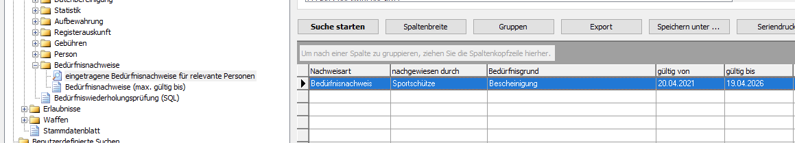 Zur Ermittlung der erstmals durch eine Person nach dem Bedürfnisgrund "Sportschütze" erworbene Waffe, sollten die in der erweiterten Suche der Condition Waffenverwaltung bereitgestellten Auswertungen aus dem Ordner "Bedürfnisnachweise" verwendet werden.