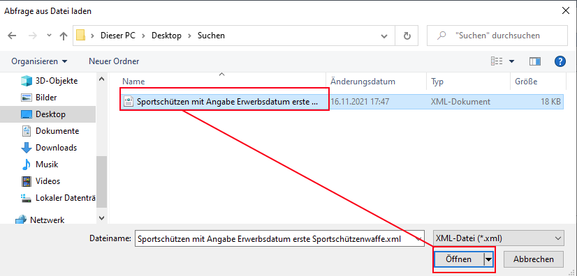 Im darauffolgenden Dateiauswahldialog wählen Sie die heruntergeladene XML-Suchdatei auf Ihrer Festplatte aus und klicken auf [[Öffnen].