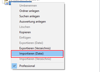 Um eine Suchvorlage in die erweiterte Suche zu importieren, klicken Sie mit der rechten Maustaste auf den Ordner Benutzerdefinierte Suchen bzw. Öffentliche Suchen. Wählen Sie aus dem Untermenü den Punkt Importieren (Datei) aus.