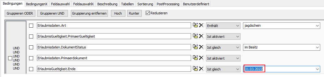 Bevor Sie die Auswertung starten, beachten Sie bitte, dass alle im Bereich Bedingungen befindlichen Datumsangaben auf den korrekten Stichtag eingestellt werden müssen, bspw. den 31.03.2022.