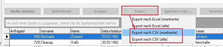 Das Suchergebnis kann von Ihnen über die Schaltfläche [Export] durch Auswahl des Untermenüs Export nach CSV (markierte) für bspw. 150 markierte Datensätze bzw. Export nach CSV (alle) in eine mit Microsoft Excel weiterverarbeitbare Datei übergeben werden.