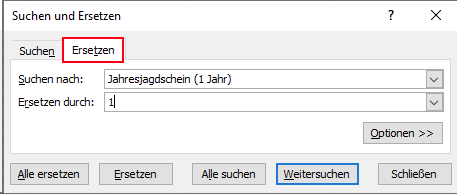 Verwenden Sie die in Microsoft Excel enthaltene Funktion Ersetzen (Tastenkombination [STRG] + [F]), um die Jagdscheinart im Feld Dauer für den Verfassungsschutz aufzubereiten.