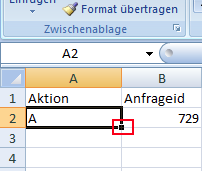 Das Feld Aktion kann durch die automatische Ausfüllfunktion von Excel mit dem Wert A ergänzt/ersetzt werden. Befüllen Sie dazu das Feld der ersten Tabellenzeile mit einem A.