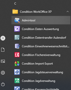1. Öffnen Sie die WorkOffice Administration entweder über den WorkOffice Schnellstartwürfel in der Taskleiste oder über die im Windows-Startmenü befindliche Option "Condition WorkOffice -> Admintool".