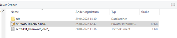 4. Navigieren Sie zum Speicherort des Zertifikates auf Ihrer Festplatte bzw. einem Serverlaufwerk, wählen Sie die Zertifikatsdatei SP-WAS-DIANA-51094.p12 aus und klicken Sie auf [Öffnen] im unteren Bereich des Explorerfensters.