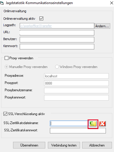 Aufgrund der befristeten Gültigkeit des bisher für die verschlüsselte Kommunikation mit der Jagdstatistik verwendeten SSL-Zertifikats muss ein Austausch bis zum 21.05.2022 in der Jagdstatistikkonfiguration von Condition WorkOffice erfolgen.