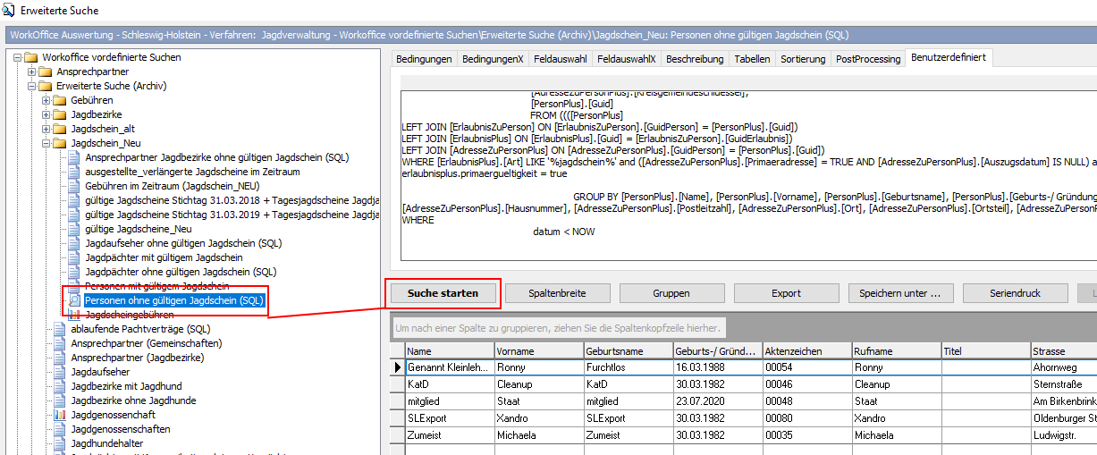 Navigieren Sie über die links befindliche Baumansicht der erweiterten Suche zur Vorlage "Personen ohne gültigen Jagdschein (SQL)" und klicken Sie auf [Suche starten].